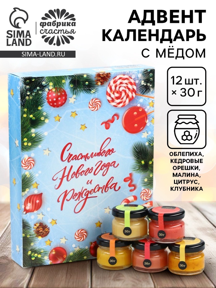 10689453 Адвент календарь новогодний с мёдом «Счастливого Нового года», облепиха, кедровые орешки, малина, цитрус, клубника (12 шт.×30 г)