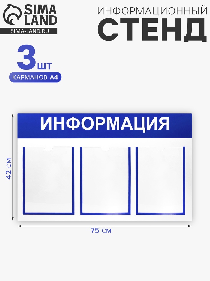4263525 Информационный стенд «Информация» 3 плоских кармана А4, цвет синий
