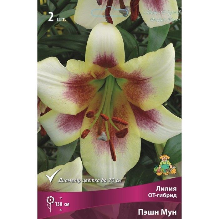 Лилии - многолетние луковичные растения. Высота у разных видов от 30 до 200 см. Есть сорта для выращивания в горшках.ОТ-гибриды – необыкновенные по красоте лилии. Получены в результате скрещиваний между лилиями восточной и трубчатой и их гибридами. Растения обладают прочными, крепкими побегами. Цветки очень крупные (20-25 см в диаметре), широкочашевидной или воронковидной формы, направлены вверх или в сторону. Массовое цветение начинается во второй половине июля. Широко применяются для круглогодичной выгонки, дают прекрасную срезку, хорошо переносят транспортировку, подходят для выращивания в открытом грунте. На зиму требуют укрытия.Пэшн Мун - высота растения 130 см. Цветок КРУПНЫЙ, кремово-белый со светло-желтым кантом, бордовыми пыльниками и мазками от центра, диаметр цветка 20 см. Месторасположение: Предпочитают солнечные или слегка затенённые места.Почва: любая хорошо дренированная почва, богатая питательными веществами, рыхлая, песчано-глинистая, известкованная.Посадка: Срок осенней посадки - август-сентябрь, весенней – конец апреля-май. Глубина посадки – 10-15 см. На одном месте могут расти от 3 до 5 лет.Уход за растениями заключается в поддержании почвы во влажном, рыхлом состоянии, проведении подкормок. Хорошо замульчировать посадки. Большинство видов лилий не требует выкопки на зиму.Использование: в групповых посадках, миксбордерах, клумбах, на срезку.