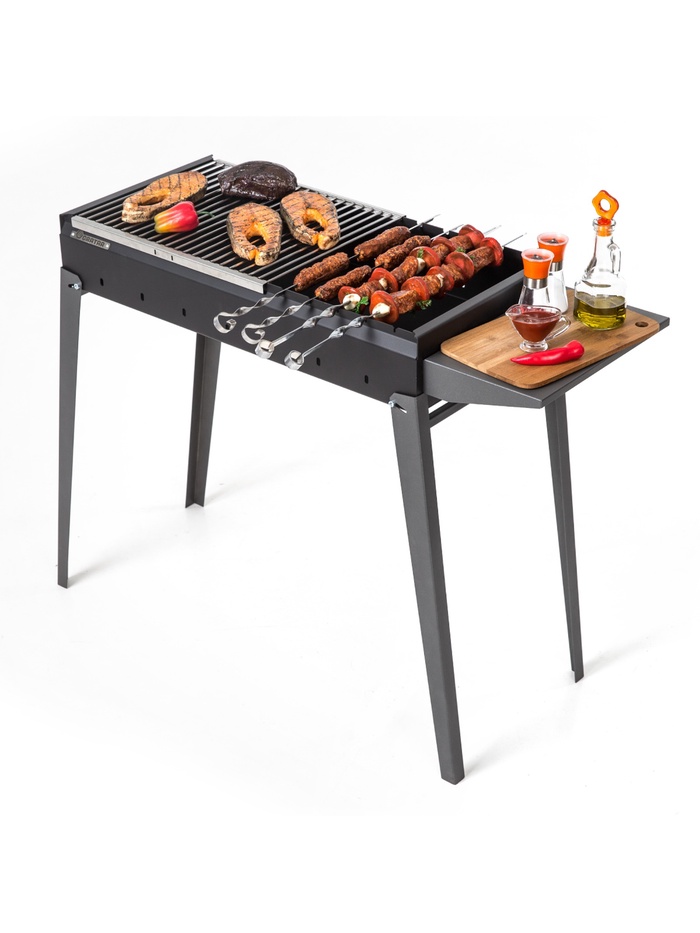 Рабочая зона шириной 75 см рассчитана на размещение до 13 шампуров и приготовление до 3 кг мяса одновременно. Модель оснащена полкой для удобного размещения продуктов и инструментов, обеспечивая комфорт при приготовлении блюд на свежем воздухе.