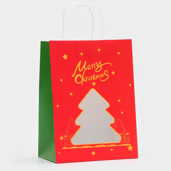 10851703 Пакет подарочный бумажный с окном «Ёлка» 30×22×14 см, крафт красный