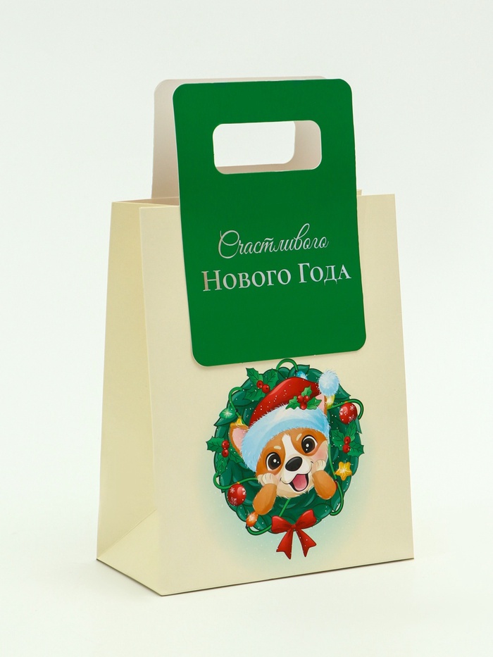 10851732 Пакет подарочный с вырубной ручкой «Новогодний корги» 18×23×9 см, зеленый