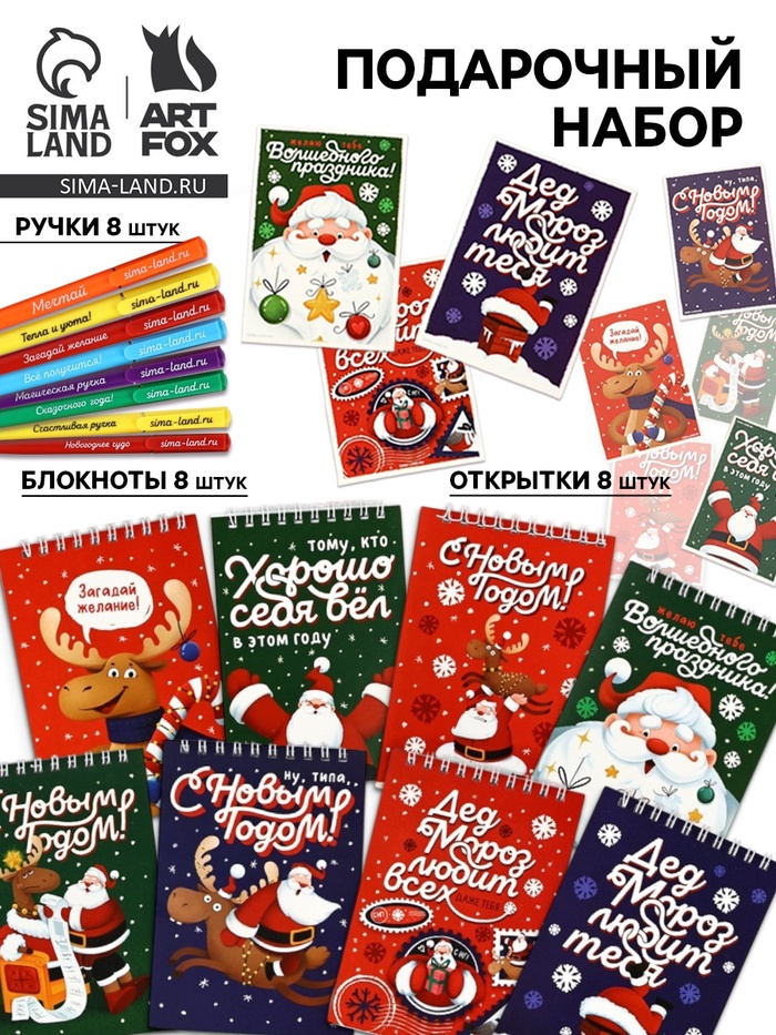 10871128 Подарочный набор новогодний, 8 ручек, 8 открыток, 8 блокнотов МИКС