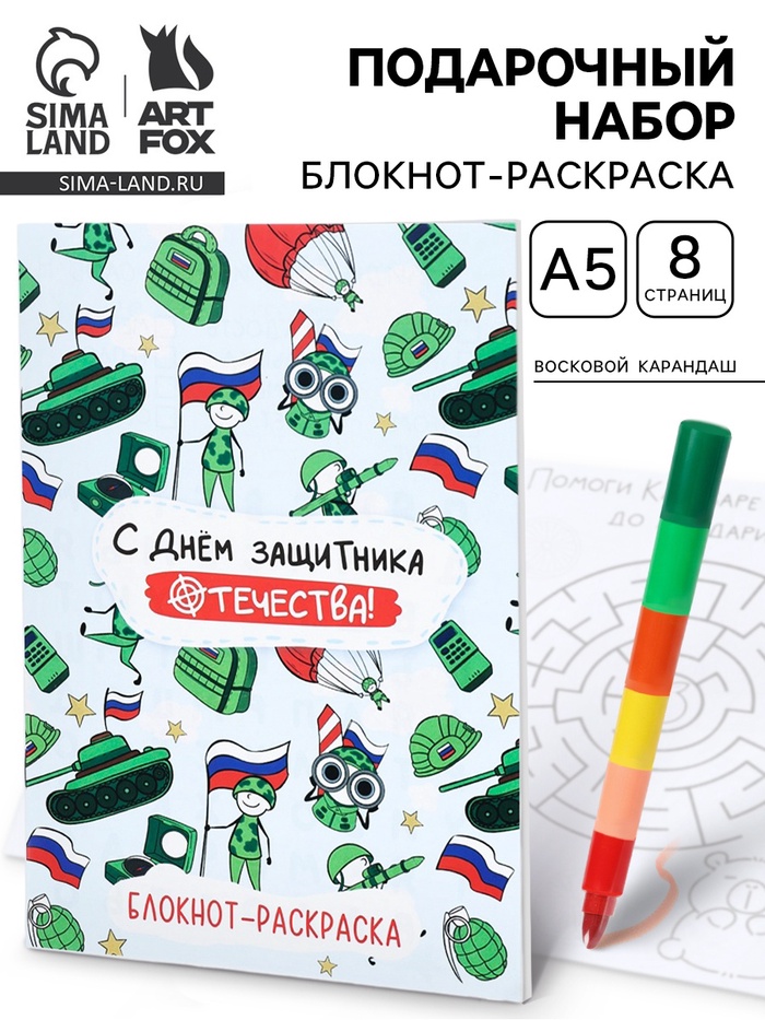 10910392 Подарочный набор «С днем защитника отечества», блокнот-раскраска А5, 8 страниц и восковой карандаш