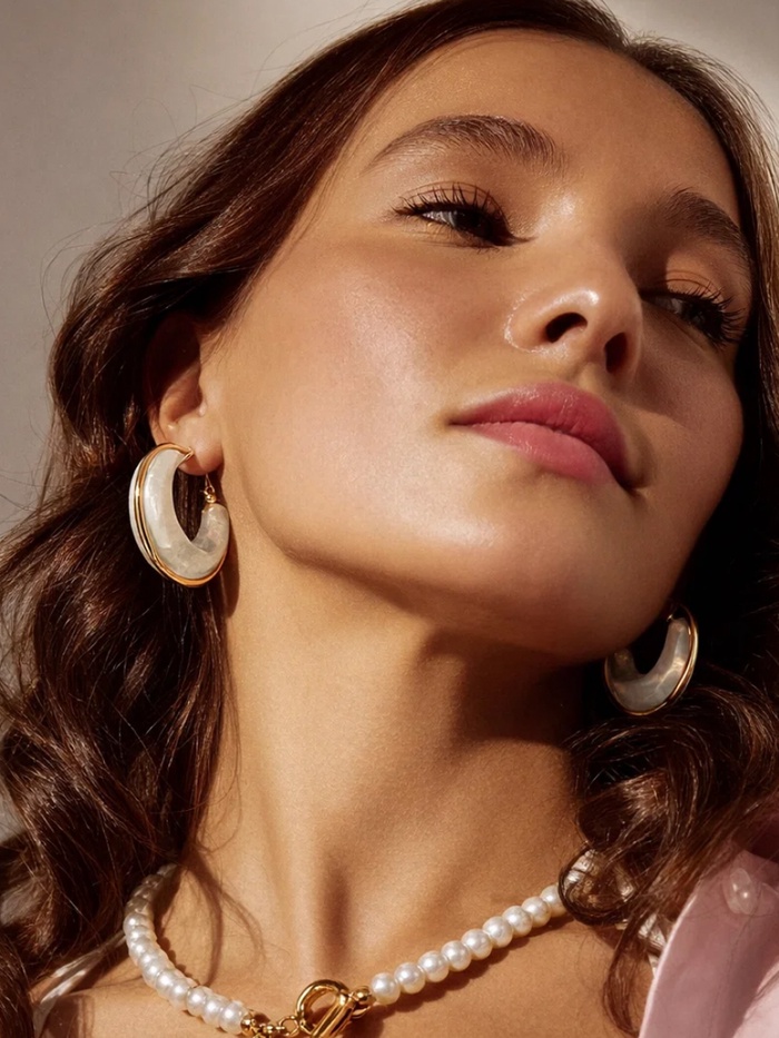 Станьте центром внимания с элегантными и современными серьгами-кольцами из полистоуна, окрашенными в нежный молочно-белый цвет и окаймлёнными приятным золотистым металлом. Небольшие и скромные, они представляют собой настоящий тренд сезона, гармонично сочетающийся с разными стилями и создаваемый руками талантливых дизайнеров.