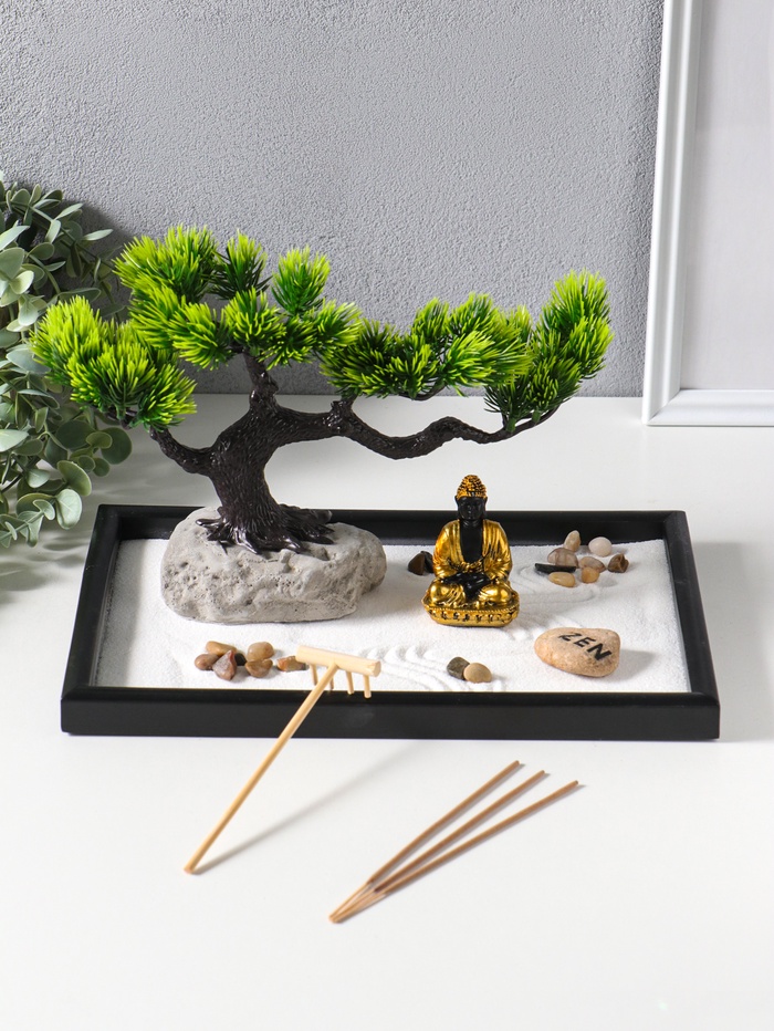 Японский сад камней настольный «Дзен. Будда у раскидистого дерева», с подставкой для благовоний и набором аксессуаров, 29.7×19.8×18 см (артикул 10961677) ЕОНК